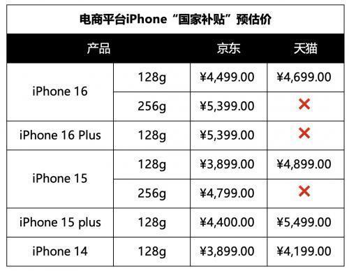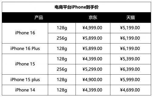 以128G的iPhone 16为例,京东价4999元,享受“国度补贴”15%优惠再减500元,最终得手价为4499元;天猫价5199元,使用国度补贴后的价钱预估是4699元。